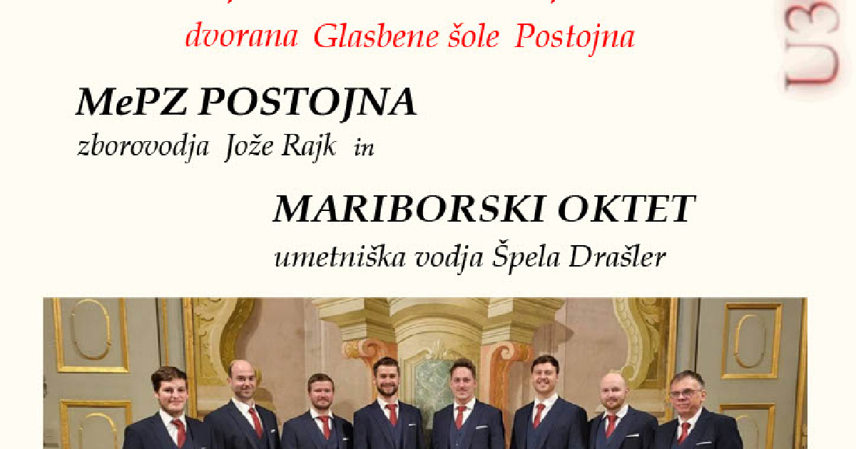 Mešani pevski zbor Postojna gosti na zadnjem letošnjem koncertnem utrinku Mariborski oktet, ki po kvaliteti poustvarjanja sodi v sam vrh slovenskih oktetov. Koncert bo otvoril MePZ Postojna z novim zborovodjem Jožetom Rajkom.