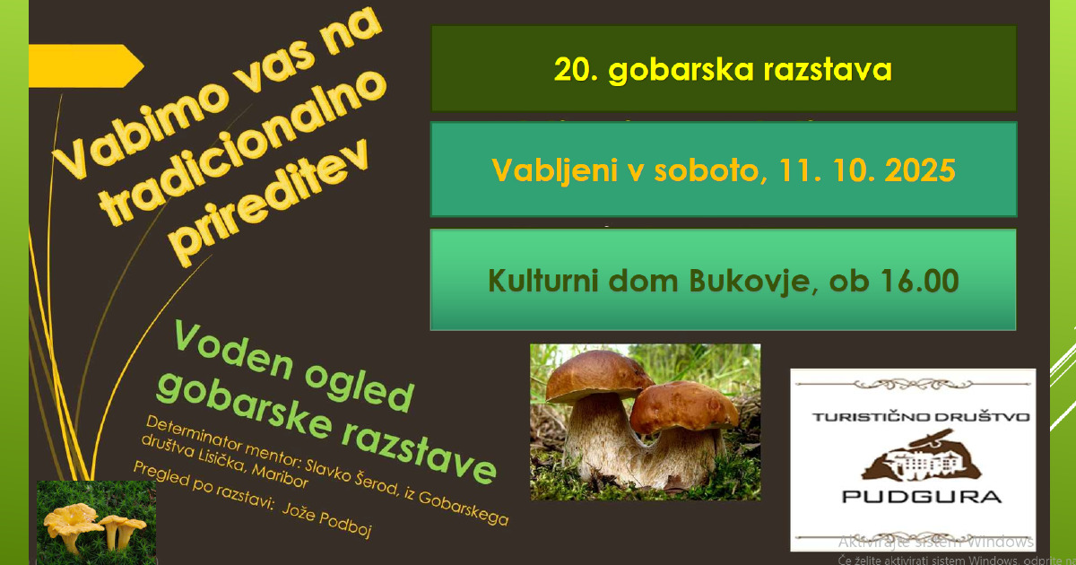 Prepoznavanje gob je pomembno. Tradicionalna 20. gobarska razstava bo v Kulturnem domu Bukovje. Pripravljata jo determinator mentor Slavko Šerod, ter Jože Podboj, ki nas bo tudi vodil po celotni razstavi. Lepo vabljeni!