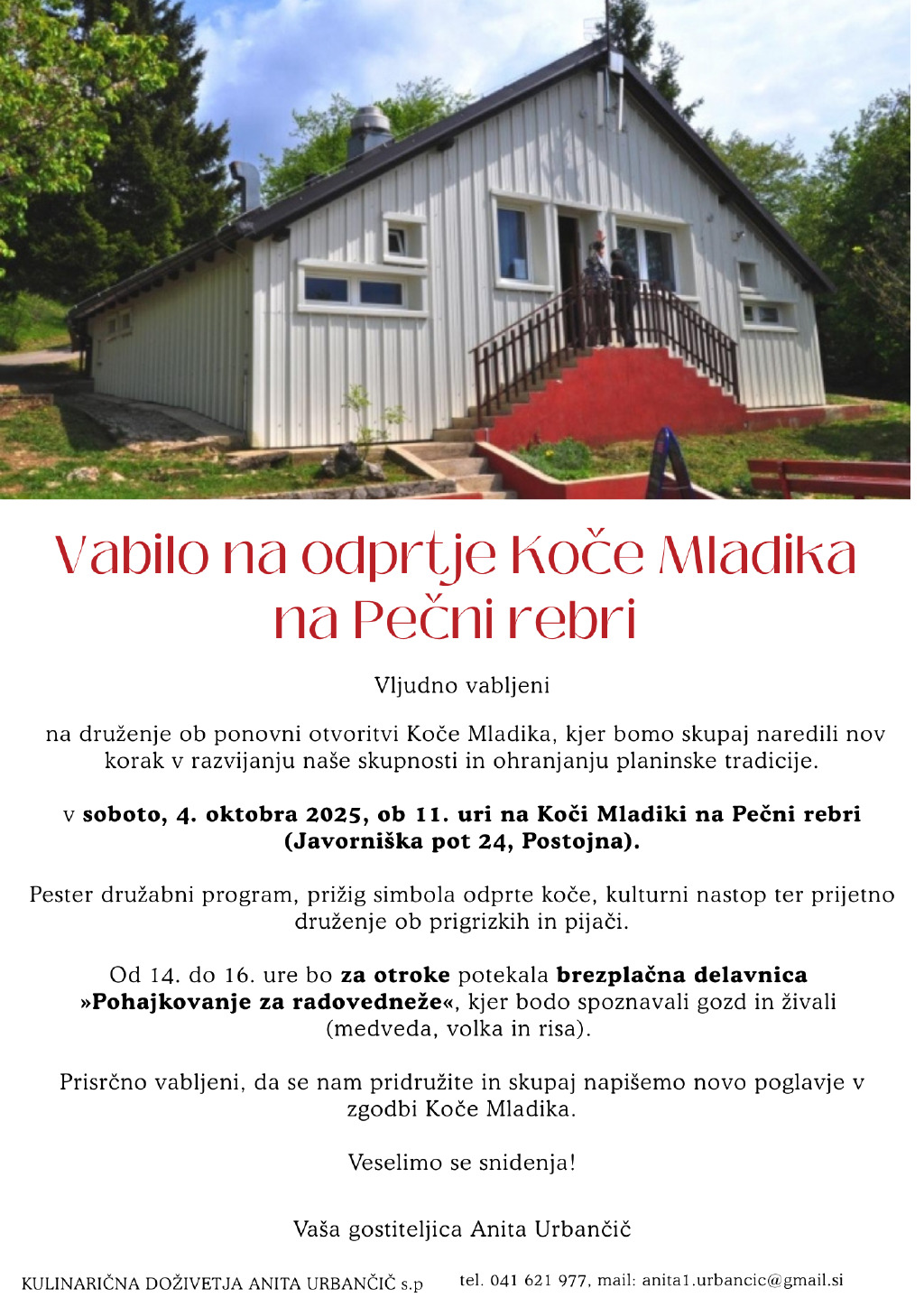 Vabljeni na ponovno otvoritev Koče Mladika – v soboto, 4. oktobra ob 11. uri! Čaka vas pester program, otroška delavnica in prijetno druženje!