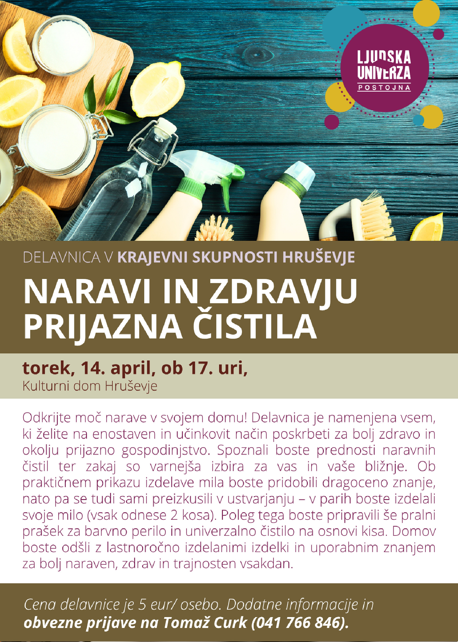 Vabljeni na zanimivo in poučno delavnico, kjer boste odkrili številne prednosti uporabe naravnih čistil!