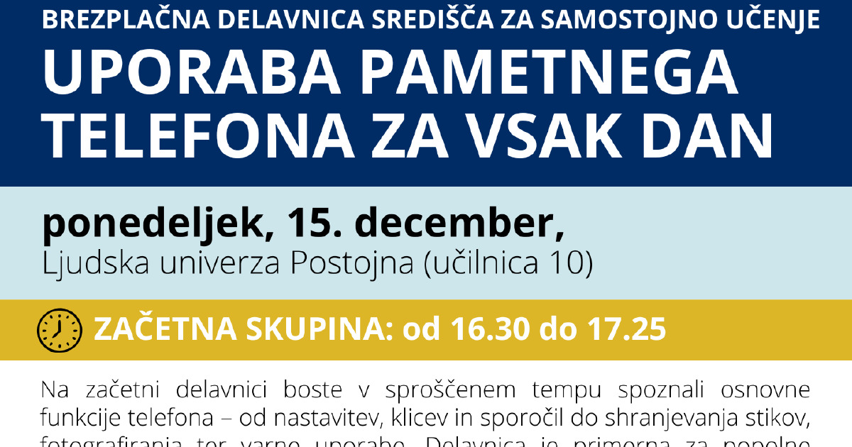 Vabljeni na začetno in nadaljevalno brezplačno delavnico uporabe pametnega telefona. Začetna skupina: 16:30- 17:25 Nadaljevalna skupina 17:30- 18:25