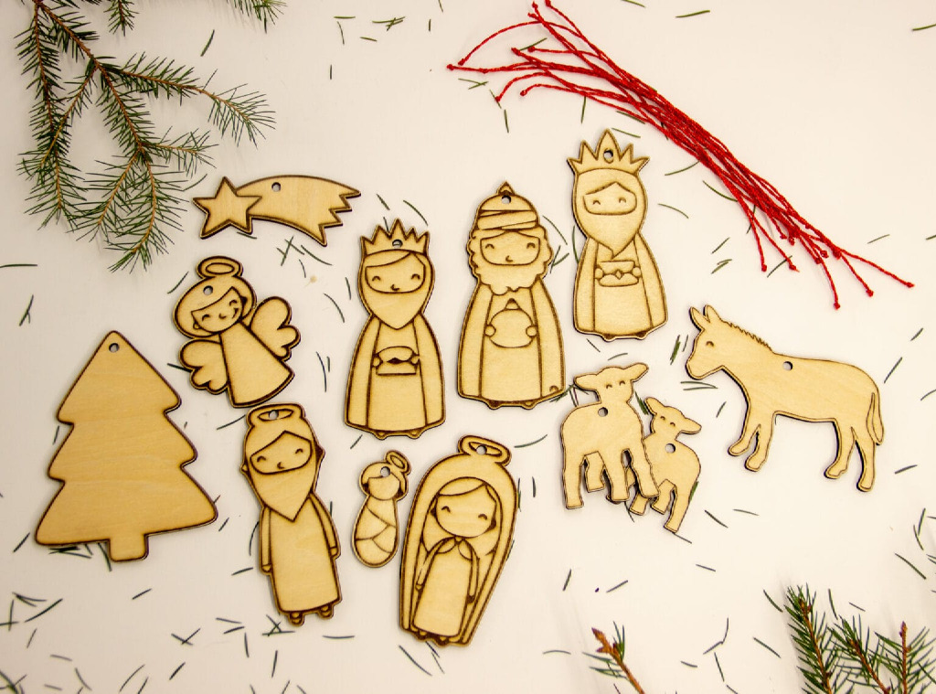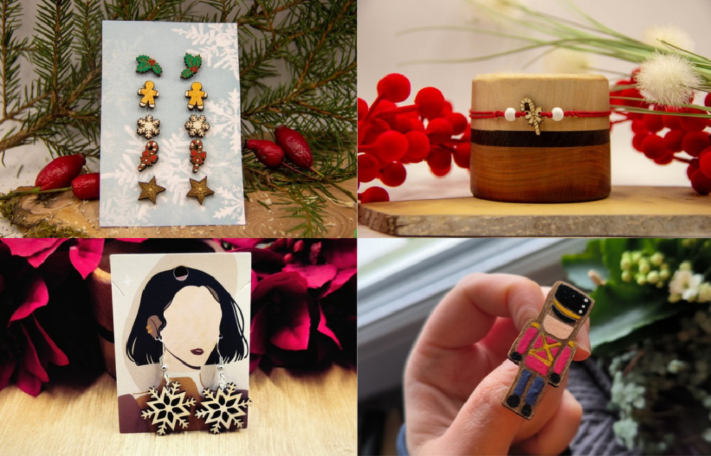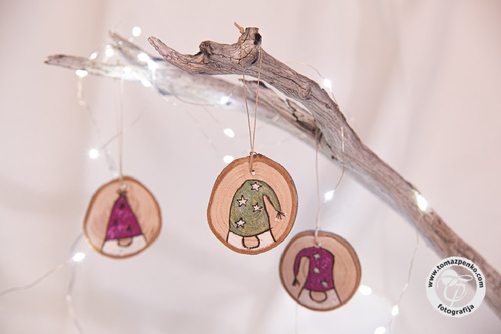 Nataša ustvarja unikatne lesene in keramične okraske za praznično drevesce – od zvezdic in palčkov do angelčkov ter simpatičnih prašičkov za srečo. Njeni izdelki prinašajo topel praznični pridih. Tomaž pa skrbi za natančno oblikovane lesene okraske, ki jih po želji tudi lasersko gravira.