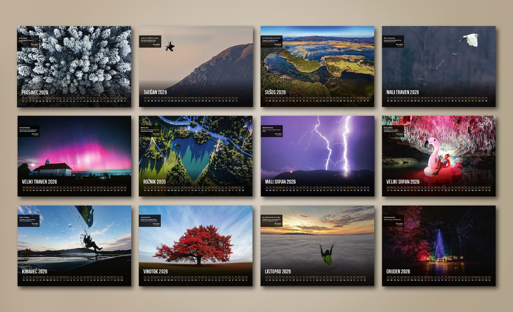 S strani National Geographica dvakrat zapovrstjo nagrajeni fotograf Žan Kafol ponuja unikatni A3 koledar ležečega formata za leto 2026 s starinskimi imeni mesecev z avtorskimi fotografijami. Fotografije prikazujejo lokalno, notranjsko pokrajino iz postojnske, cerkniške ali bloške občine v različnih perspektivah - pod, na in nad zemljo.