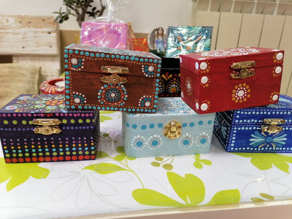 Urška Jurić ustvarja unikatne poslikave na lesene izdelke: od šatuljic, knjižnih kazal, magnetov do lesenega nakita. Na voljo so tudi male grafike in voščilnice za v okvir v različnih tehnikah. Zgodbe na papirju in lesu se odvijajo pod imenoma Mešani občutki in Občutki.