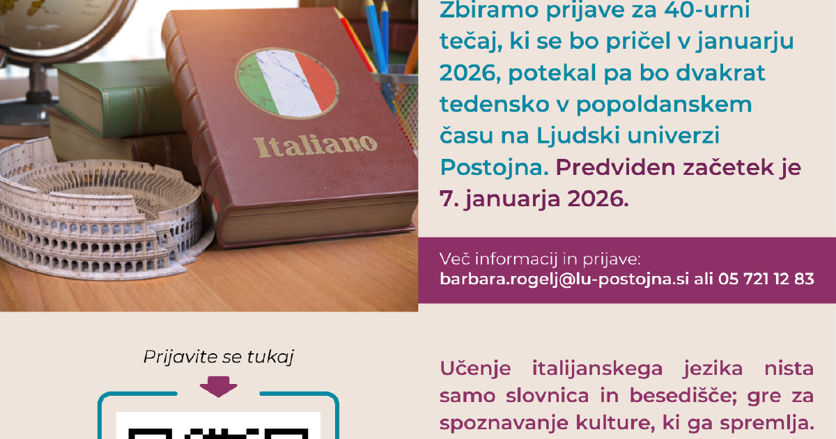 V januarju začenjamo z novim tečajem italijanskega jezika, prvo srečanje bo 7. januarja 2026.