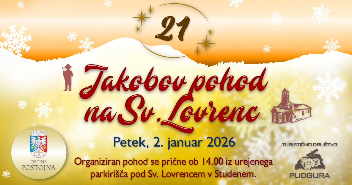 Vabimo vas na 21. pohod na Sv. Lovrenc, ki ga organizira občina Postojna v sodelovanju s TD Pudgura, 2. 1. 2026, ob 14.00