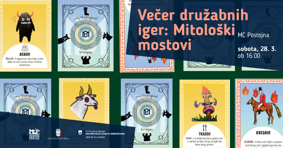 Vabljeni na prijetno druženje ob igranju prav posebne družabne igre. Kaj je tako posebnega na njej? Gre za igro, ki smo jo razvili in oblikovali skupaj z mladimi iz Poljske, Španije, Italije in Slovenije na Erasmus+ izmenjavi Mitološki mostovi, nanjo smo zato še toliko bolj ponosni. Se vidimo v soboto, 28. marca, ob 16.00 v Mladinskem centru Postojna!