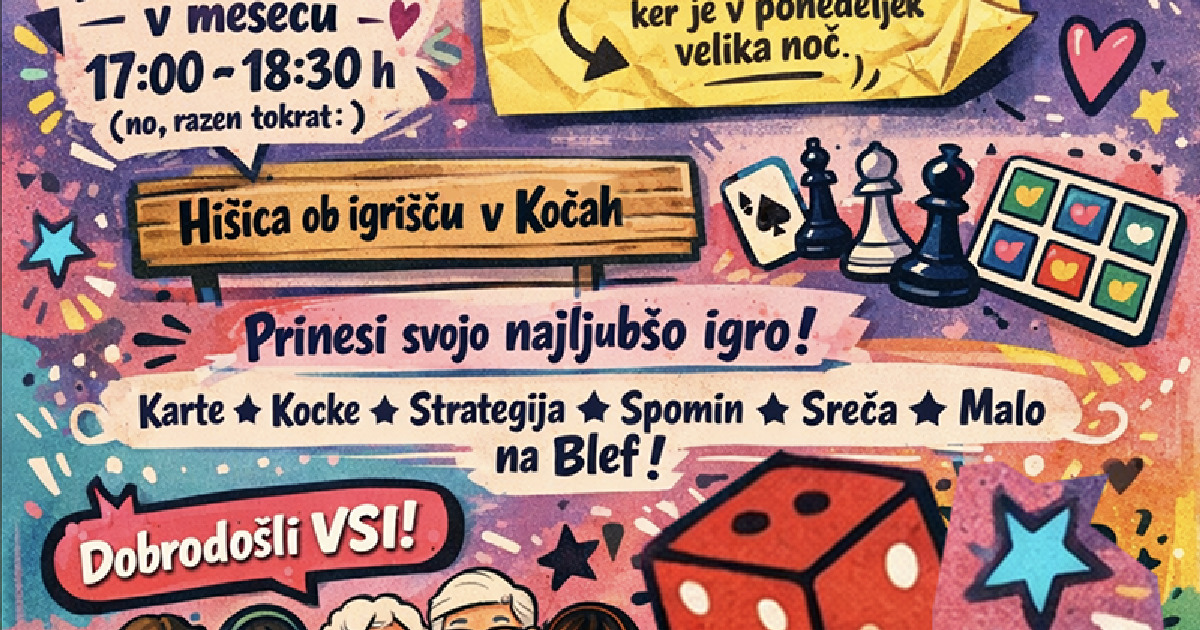 Prinesi svojo najljubšo namizno igro in pripelji svojo najljubšo igralno družbo. Igramo vse (karte, kocke, strategijo, spomin, srečo in včasih malo na blef). Dobrodošli vsi (vseh starosti). Vidimo se v hišici na igrišču v Kočah.